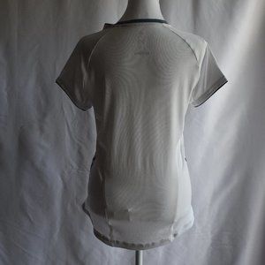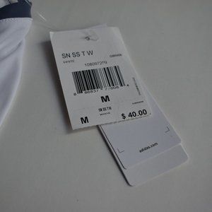 Adidas, medium, white with adidas blue stripes, sports short sleeve tee. Great workout shirt!!