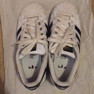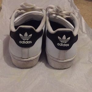 Classic Adidas Superstar. Still in good condition. Surface dirt, but nothing a moist towel can’t fix. These run big. I normally wear a size 4/4.5Y for reference.