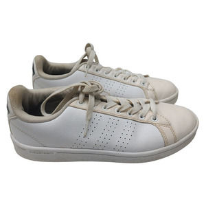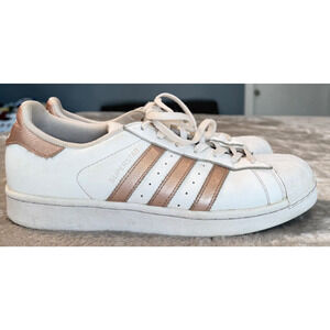 Classic Adidas Superstar sneakers in the iconic white with black stripes colorway. These shoes show signs of wear consistent with regular use but still have plenty of life left.
