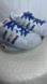 Vibrant Adidas sneakers with blue accents. Fun graphic design. No tie laces in sparkle blue