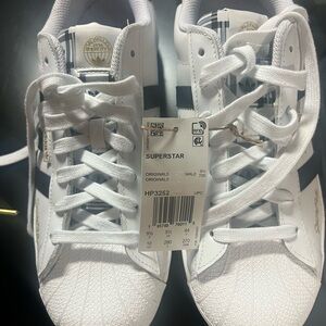 Classic Adidas Superstar shoes. White base with black stripes. Gold detailing adds elegance.