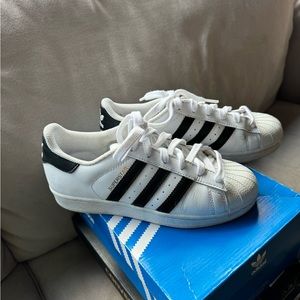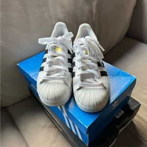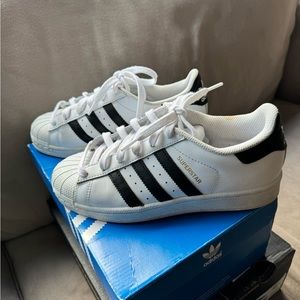 Gently worn Adidas Superstar tennies in big kids siz 4. White leather with black stripes. See pictures for wear. There are marks on the inside upper leather and on the left shoe as you put your foot into the shoe. Inside has black threads/fuzz from black socks. Message me if you have questions.