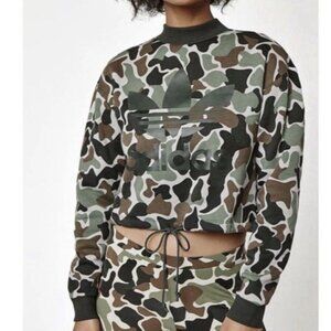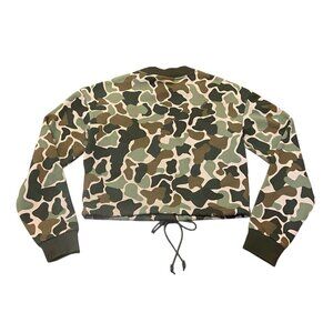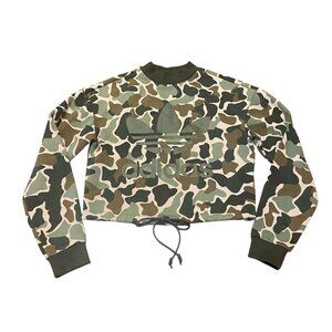 The Adidas Sweater is a women's size XS green cameo crew neck sweatshirt made from fleece fabric with an embroidered logo accent. It features a cropped style with a drawstring closure, perfect for travel, activewear, or casual occasions. The sweatshirt is easy to care for and suitable for all seasons with a camouflage pattern. Made with polyester lining and material, this pullover sweatshirt from Adidas Originals is ideal for various activities such as gym training, track and field, cycling, hiking, and running.