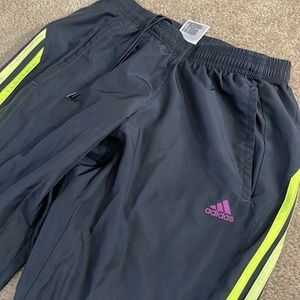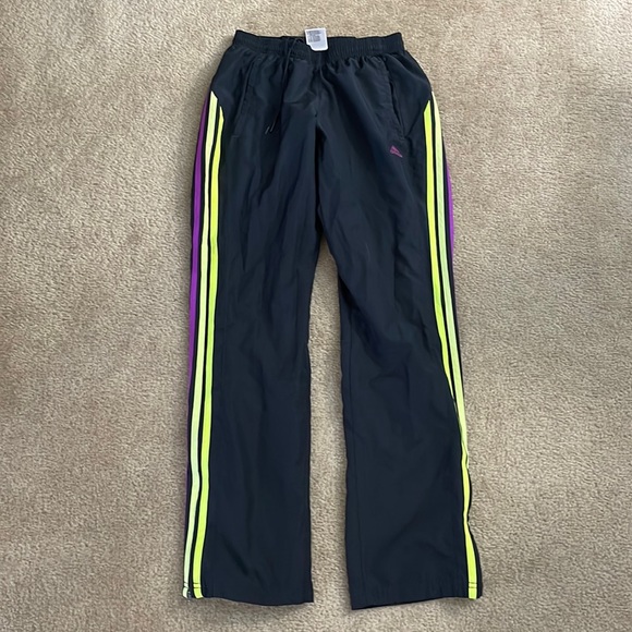 Adidas lime green & purple stripped sweatpants that are knitted in the inside, with strings available to pull tighter in the front. It’s also has zippers on the ends of each leg to make a flare.