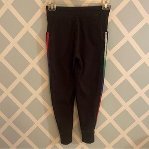 Stylish Adidas kids joggers in black with vibrant multicolor stripes. Perfect for active days.