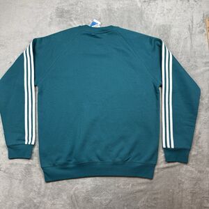 Up for sale is an Adidas men's sweatshirt in teal color with a crew neck and long sleeves. The sweatshirt features a classic striped pattern with the Adidas logo as an accent. It is made of a combination of polyester, cotton, and cashmere materials with a fleece fabric type, making it lightweight and suitable for all seasons.