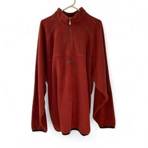 This Adidas men's quarter zip fleece mock neck sweatshirt comes in a rust orange color with black trim accents. It features a soft polyester fleece construction, long sleeves, and an embroidered Adidas logo on the chest. Designed with a relaxed fit in a big & tall size, this pullover is ideal for layering, casual wear, streetwear or athleisure.