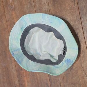 Adidas bucket hat with a vibrant swirl design. Features a mix of green and blue shades.