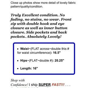 Truly Excellent condition. No fading, no stains, no wear. Front zip with double hook and eye closure as well as inner button closure. Side pockets and back pockets. Absolutely Lovely!
