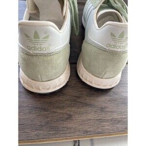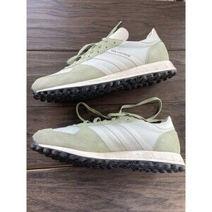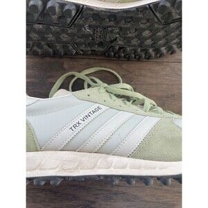 This is a pair of pre-owned Adidas TRX sneakers for men in a vibrant green color called Magic Lime. The shoes feature a low-top design with a lace-up closure and are made of suede material. They have a standard shoe width and come in a UK size 8.5 or a US size 9. The model number is GX4581, part of the adidas TRX product line released in 2022 from Vietnam. These athletic sneakers offer a retro style with a classic look suitable for casual wear or running activities.