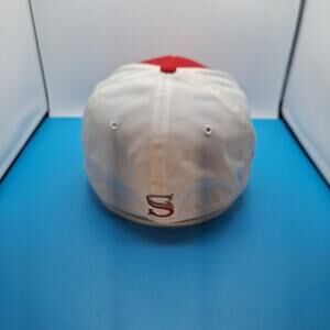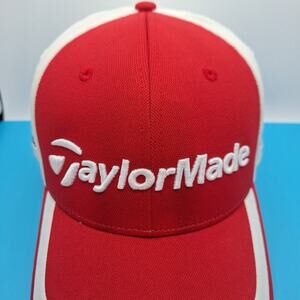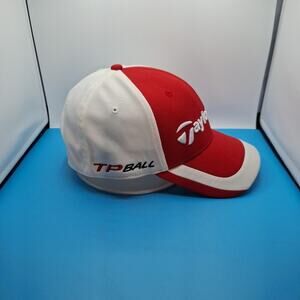 Adidas TaylorMade Golf Baseball Cap Hat Fitted L/XL Red R9 TP Ball. This lightweight and comfortable hat is perfect for any casual occasion, especially on the golf course. Made of high-quality polyester material, it features a solid pattern with the TaylorMade brand logo and a golf ball theme. The hat is designed to fit most with its one-size-fits-all style and is ideal for men. It is suitable for various outdoor activities, including golf, and is easy to carry.