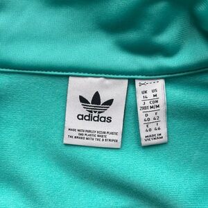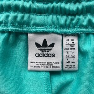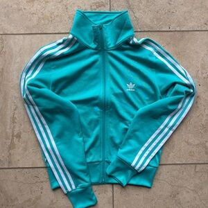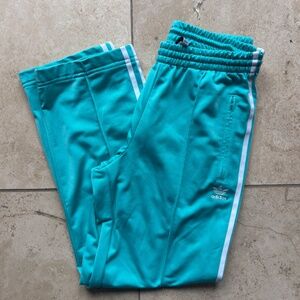 Barely worn, only 1-2 times. Stylish teal Adidas track suit with white stripes. Zip-up top and straight-leg bottoms, both size Medium. Bottoms have been hemmed to a 28" inseam. Great condition!