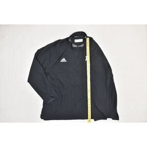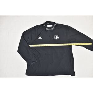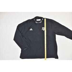 This is a used Adidas Texas A&M Aggies lightweight pullover jacket in a Men's Size 2XL. The jacket is a solid black with a large white 'ATM' logo on the chest. It features a quarter-zip closure at the neck and a zippered side pocket for secure storage. The collar is a stand-up style, and the sleeves have elastic cuffs. The jacket is made of a polyester blend, which is a key feature of its lightweight design. Based on the tags, the jacket is part of the Primegreen line, indicating it is made with a series of high-performance recycled materials. The jacket has a relaxed fit and is ideal for casual wear, sporting events, or outdoor activities in cooler weather. It is in excellent used condition with no visible signs of damage, stains, or tears. Please refer to the images for specific measurements to ensure a proper fit.