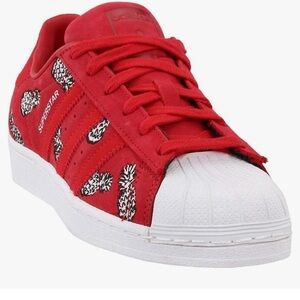 Stand out with these super unique Adidas Superstar sneakers from The FARM Company x Adidas collaboration! Featuring a bold red and white design with black and white pineapples, these sneakers are a must-have for your collection. Made from high-quality suede, they offer both style and durability. In good used condition, don’t miss out on this one-of-a-kind pair!