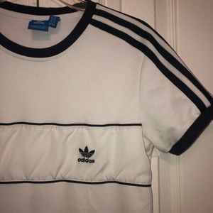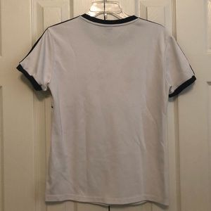 Super cool, vintage looking tee. Navy blue outline and stripes. The front detail is unique, not sure what to call it?
