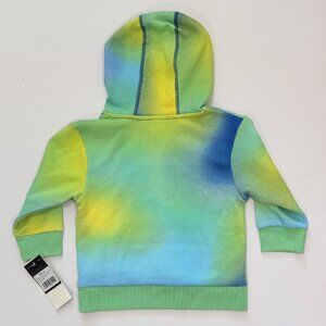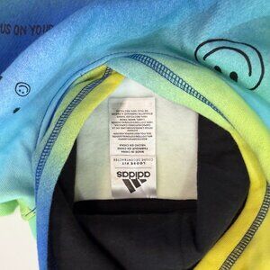 Bright and bold Adidas hoodie featuring a blue, green, and yellow tie-dye gradient with playful smiley and logo graphics. Designed in a soft cotton-blend fleece with a cozy hood and front kangaroo pocket. A fun, sporty layer for cooler days that adds a pop of personality to any outfit.