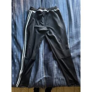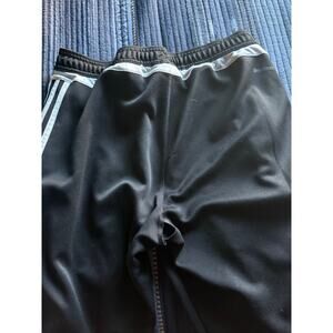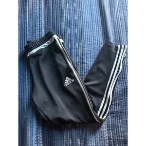Classic Adidas Tiro 19 track pants in black with white 3-stripe design and ankle zippers. Made from lightweight, breathable Climalite fabric for all-day comfort. These men’s size medium pants feature zippered pockets and tapered legs. Note: small hole near groin area (see photos) — does not affect wear. Perfect for training, lounging, or casual streetwear.