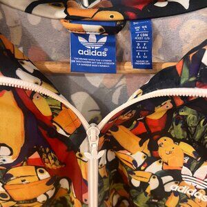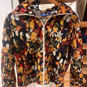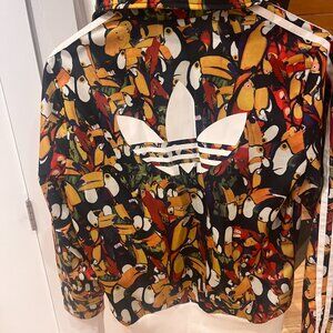 Size L Toucan Track Jacket by Adidas. Has been spot treated and cleaned, however there remain a few blemishes on the cuffs. Otherwise great condition.