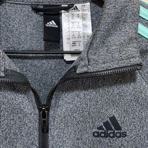 Heather gray slim-fit track jacket with teal stripes. Full zip with pockets. Great condition!