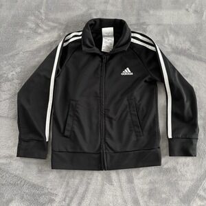 Elevate your child's sporty style with this classic Adidas track jacket! A sleek black backdrop sets the stage for iconic white three-stripe detailing down the sleeves, creating a timeless athletic look. A touch of sporty sophistication is provided by the full-zip front and stand-up collar which add both functionality and flair. The Adidas logo, subtly placed, adds a touch of brand recognition without overwhelming the design. Perfect for warming up at soccer practice, layering on a cool evening, or adding a sporty edge to casual everyday outfits.