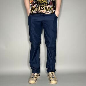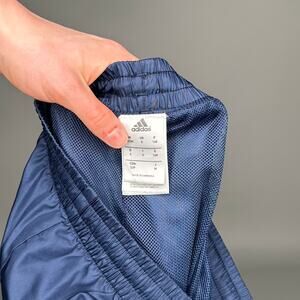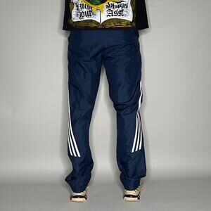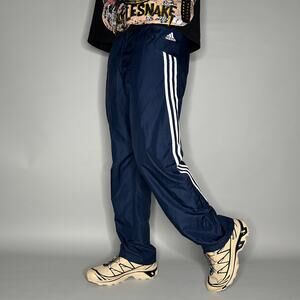 Adidas Track Pants Navy Blue Polyester Sweatpants White 3 Stripes Baggy Wide Leg