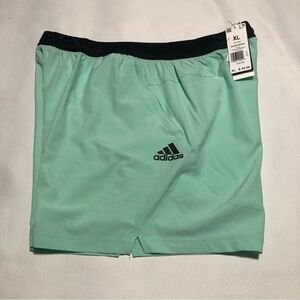 This is new with tags. The color is green. Side zip pockets. The inner drawstring waist is 36 inches stretches to 46 inches. The length from top to bottom is 17 inches with side slits. The fabric is 89 % polyester, 11 % elastane. These are training shorts.