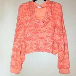 Adidas Oversized Cropped Trefoil Hoodie with Adjustable Drawstring, Dropped Shoulders and White Embroidered Logo. Color is Chalk Coral, which is an orangish pink. 100% Cotton French Terry. Excellent Like New Condition.