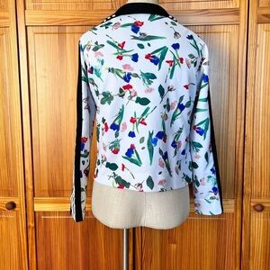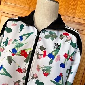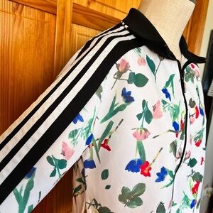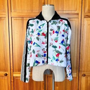 Adidas size small cropped floral track jacket. Features a full-zip front with foldable collar, signature black Adidas stripes down the sleeves, split sides with a longer length in the back, and a vibrant allover floral pattern. Sleek silhouette with no pockets, blending athletic flair with fashion-forward style.