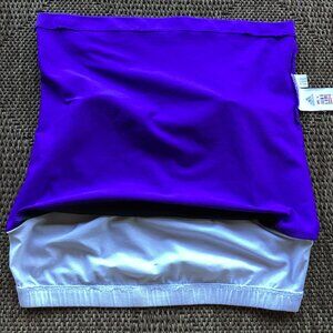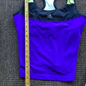 - Description: Tri-color racer-back athletic tank top. Body is a blue-ish purple color, Shoulder straps are a yellow-ish green and the rest is black. Includes a shelf bra. Would look great with black shorts.