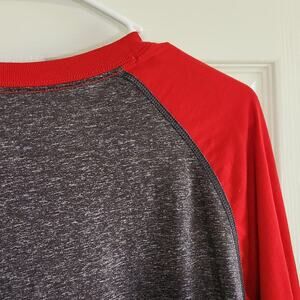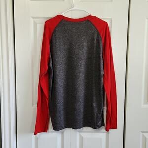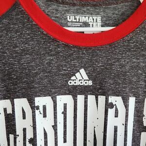 Like new t-shirt from Adidas featuring the Cardinals. Heathered dark gray & red. Long sleeves with accented stitching. Adidas, Cardinals, & picture of the bird logos on front in a distressed pattern. Climate control, lightweight, & has stretch.