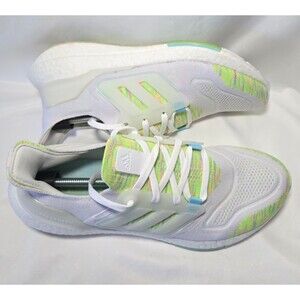 Step into performance and sustainability with these Adidas UltraBoost 22 sneakers in the striking White Bliss and Solar Green colorway.