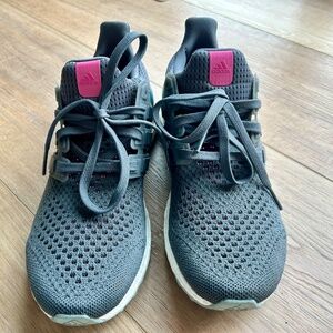 Adidas Ultraboosts 1.0 in grey, pink, and blue