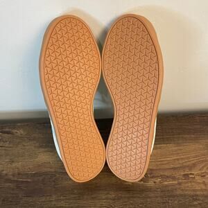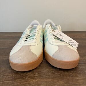 These Adidas VL Court Base sneakers are a clean, classic pair with a subtle pop of color. They feature a soft white upper with light blue 3-Stripes and a gum rubber sole that gives them a retro look. They’re brand new, never worn, and come with the original box.