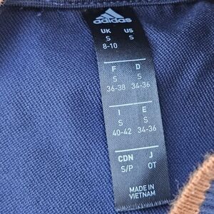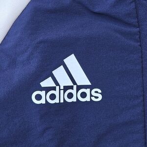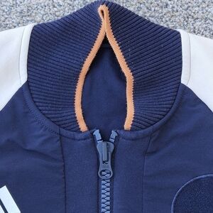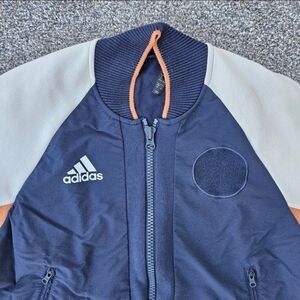 This Adidas kids zip up bomber jacket has a navy blue body, cream white and burnt orange sleeves and trim, a ribbed collar, two front hand zipper pockets, and is in excellent condition! Please see photos for details and measurements!
