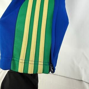 Standout pair of Adidas warm-up pants in a rare color combo. Royal blue body with buttery light-yellow stripes over a kelly-green backing, giving the classic 3-stripe look a bold, unique twist. Men’s size 2XL with side ankle zips, elastic waist, and zippered pockets. Great for streetwear, retro athletic style, Y2K, or collectors looking for uncommon Adidas colorways.