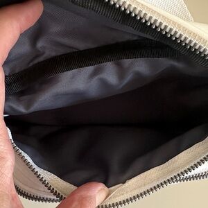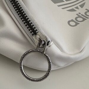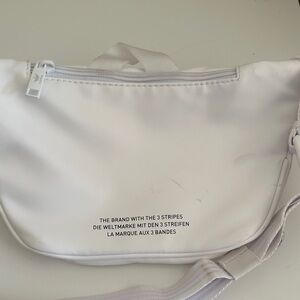 White belt bag featuring a silver Adidas logo. Ideal for hands-free style. Unisex style, soft material, very clean inside, in very good used condition. Please see photo of backside for some minor scratches.