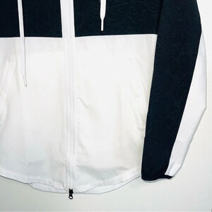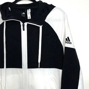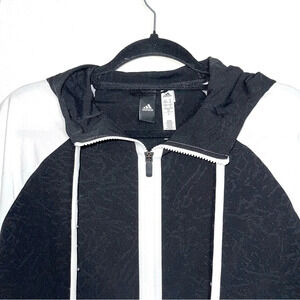 Adidas white & black color block athletic windbreaker jacket. In excellent condition! Double zip two way front closure. Hooded with drawstring closure. Long sleeves. Rounded drop tail hemline. Black Adidas logo on left sleeves. Embossed patter throughout. White & black color blocking. Size small.