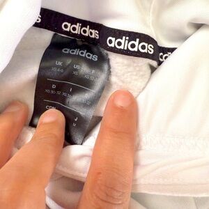 Classic Adidas style in a crisp white hoodie with bold black branding and signature 3-stripe sleeves. Size XS. Great for layering on gym days, errands, or keeping cozy in athleisure mode.