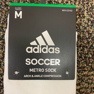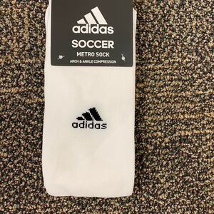 New with tags Adidas White Soccer METRO OTC SOCKS. Size Medium, nylon blend. Have allover compression fit for stability and support through every lunge and stride. Extra cushioning targets the toe and forefoot to reduce friction in these hot spots. Moisture-wicking climalite® yarn keeps feet dry and comfortable. 2 pairs. See pictures for details.