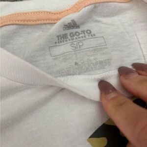 Classic Adidas white tee with subtle peach accents. Perfect for everyday wear.