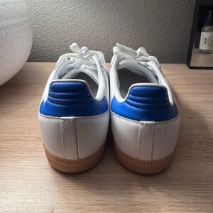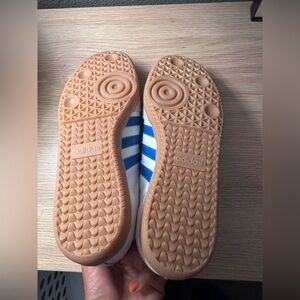 Classic Adidas Samba sneakers with a white upper and blue stripes. Tan rubber soles for durability.