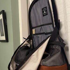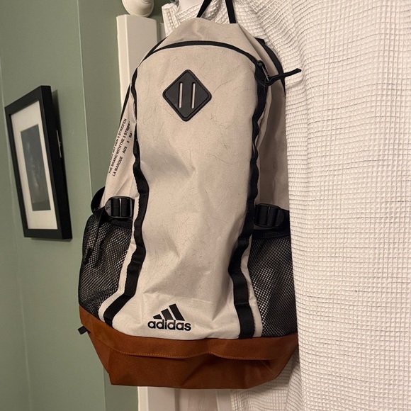 Chic Adidas backpack with white and brown design. Ideal for everyday use. Perfect for day hikes. Thick canvas like material.