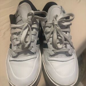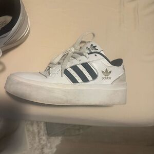 Classic Adidas sneakers with a sleek white and dark blue design. Comfortable and stylish for any occasion.