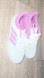 Crisp white Adidas shoes with vibrant pink stripes. Ideal for everyday comfort.