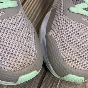 These sneakers are in good used condition. There are minor signs of wear. Minor staining on toe boxes. Tread is very good. Gray and mint color. See pics for details.