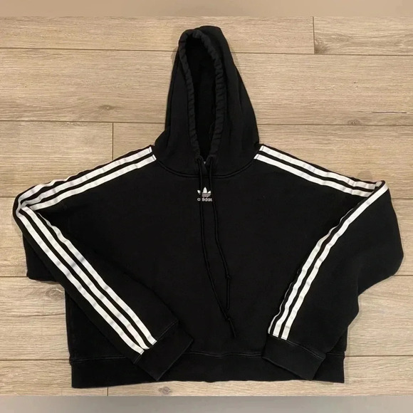 Adidas Women’s 100% Cotton Cropped Drawstring Hoodie Black White Stripes S EUC