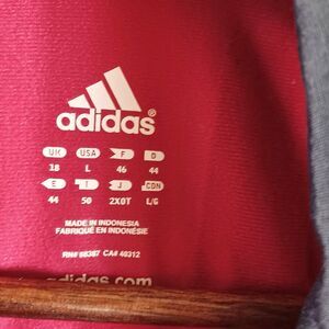This Adidas Women's Active Zip Track Jacket in size L is a mid-length jacket in pink and black, featuring a solid pattern with contrasting trim. Made of 100% polyester jersey fabric, it has long sleeves, a full zip closure, and elastic waist for a comfortable fit. The jacket is designed for various occasions like travel, activewear, and workwear, with added features like pockets, a collared neckline, and embroidered logo detailing.