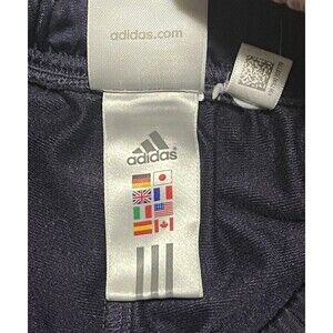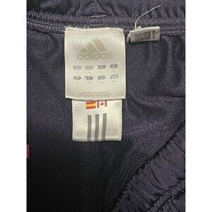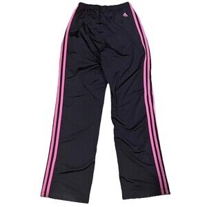 These Vintage Y2K adidas track pants in women's size small feature a navy blue color with pink stripes. Made of 100% polyester, they have a drawstring closure, straight leg style, and a 29-inch inseam. The pants are lined, windproof, and offer comfort with an adjustable waist and pockets. Suitable for activities like gym training, cross training, basketball, and running, they are perfect for summer, fall, and spring seasons.