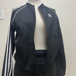 Stay stylish and comfortable with the Adidas Black Track Jacket. Perfect for casual outings or workouts, this jacket features a sleek design with iconic Adidas branding.