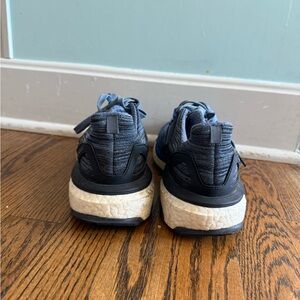 Sleek Adidas athletic shoes in black and blue. Ideal for running and casual wear. Lightweight and stylish design.